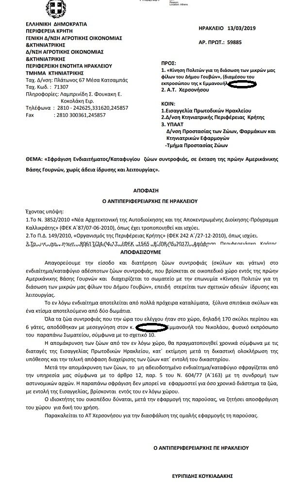 Στο κλείσιμο καταφυγίου ζώων προχώρησε τέλη Μαρτίου η περιφέρεια Κρήτης, μετά από εντολή της εισαγγελίας και αφού είχε προηγηθεί έλεγχος της αστυνομίας από τον οποίο διαπιστώθηκε ότι δεν υπήρχε άδεια λειτουργίας.